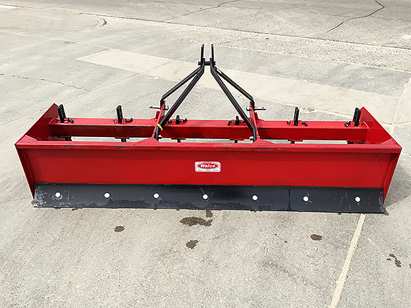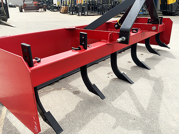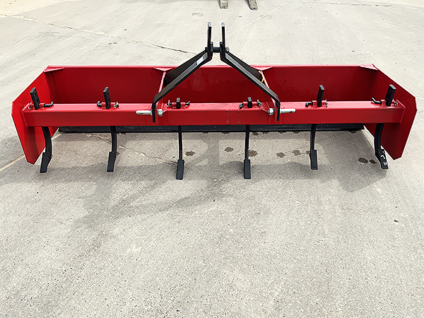 Description: New Walco Renegade 124127 HD7 3 pt 7' heavy duty box blade with 6" bolt-on reversible cutting edges and 6-pin adjust scarifier teeth. Red color. Weighs 507 lbs. Includes freight to dealer and setup.