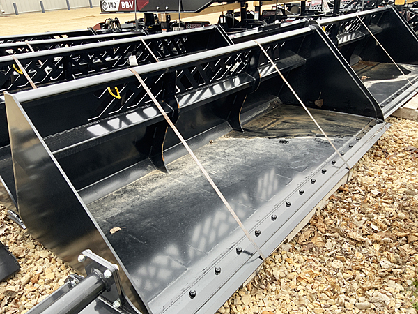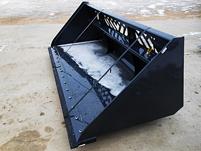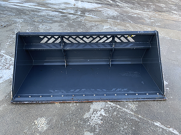 New Virnig SBHV101 101" heavy duty snow/light material bucket, 62.6 heaped cubic foot capacity with 5/8" X 8" double-bevel, bolt-on reversible cutting edge. Weighs 1,381 lbs. Lists @ $4,565.