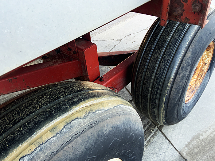Description: Used Meyer 3118 18-foot hydraulic-drive rear-unload forage box, transport lights, Meyer 1200 tandem axle wagon running gear, 12.5LX15 rib implement tires, extension tongue. Serviced through shop. Older box in very good condition.
