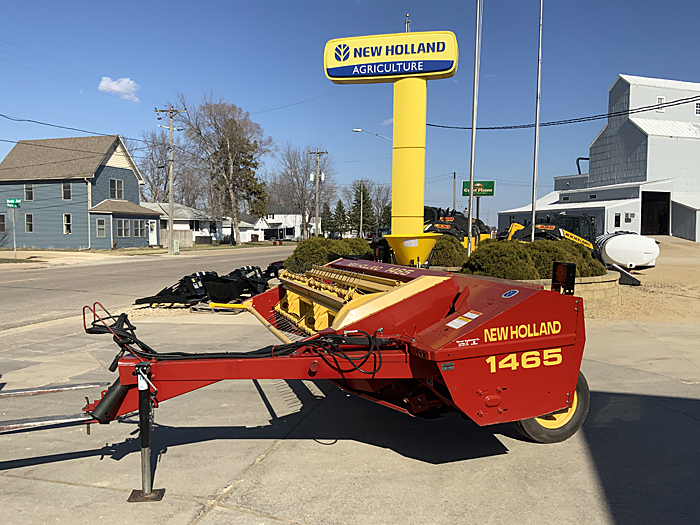 Used New Holland 1465 Haybine mower conditioner, 9' 3" cut, rubber conditioner rolls, 540 PTO, hydraulic tongue shift, hydraulic lift cylinder, transport lights, low usage, very sharp, well-kept unit, original paint (no touchup). Serviced through our shop.