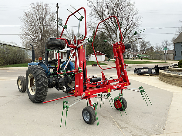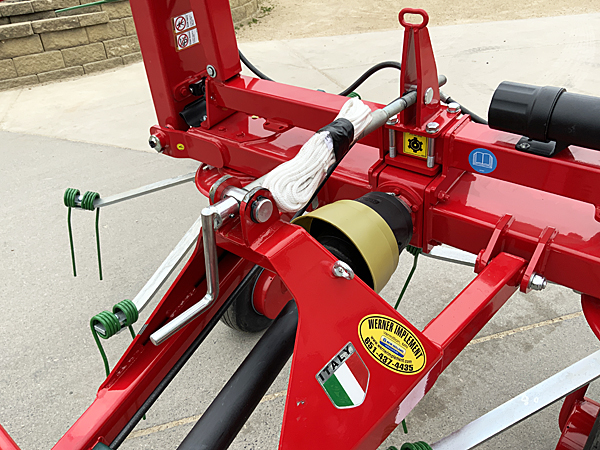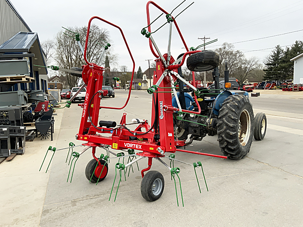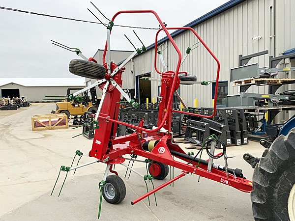 Description: New Enorossi G4V 520 PTH 17-foot hay tedder, hydraulic folding wings, mechanical hand crank rotor tilt, 540 PTO with slip clutch, set of four 16X6.50-8 wheels and tires, four rotors with 24 tine arms and six tines per rotor. Weighs 1,146 lbs. Includes cylinders, hoses and male hydraulic ends. Setup and ready to go. Lists @ $9,795, including freight & setup. We have three one unit in stock. 12/03/2025