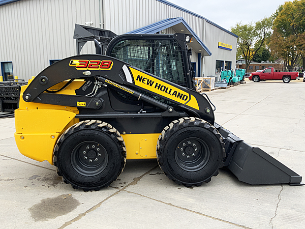 New New Holland L328 SSL, cab with heat/AC/radio, 2-speed, mechanical hand & foot controls, air ride seat, hydraulic Q-tach plate, LCD display, engine block heater, steel lights with turn signals, performance with front electric, 14X17.5 heavy duty tires (76 OTW), low profile extended bucket with bolt-on cutting edge, ride control, self-leveling, auxiliary hydraulics.