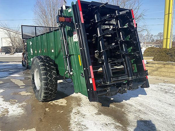Description: New ARTSWAY X350 single axle vertical beater manure spreader, Berma brand beaters, 540 RPM drive (also available with 1,000 RPM drive), holds 367 cubic feet, guillotine-style slop gate, 16 R20 used military factory installed tires, ½" thick Densilite floor, single apron with 88C pintle chain, tube style apron slats, hydraulic drive variable speed apron, reversible apron drive, estimated 30-foot spread width, 2" swivel hitch, combination single tang/clevis, safety tow chain, transport lights, heavy duty tongue jack. Weighs 8,020 lbs., requires 100-125 HP. Also available with tandem axle.