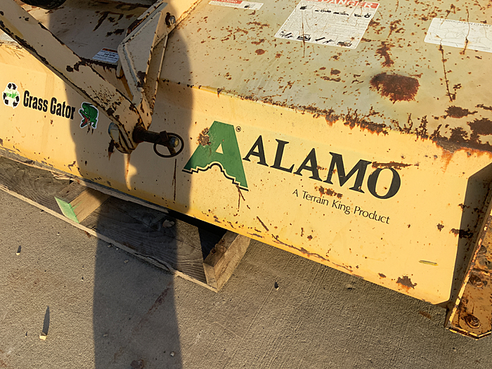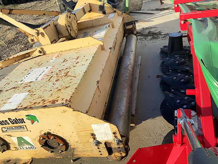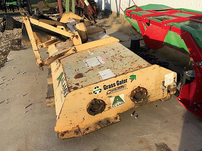Description: Used Alamo Industrial GG74 Grass Gator twin-flail mulching mower, 74" cutting width, two flail shafts with 184 knives per each shaft, rotation of front shaft is forward, rotation of rear shaft is reverse, 6" diameter full-width rear roller adjustable from 0" to 6" cutting height, full-length replaceable skid shoes, 540 PTO 60 hp gear box, double C belt-driven flail shafts, requires tractor with minimum of 30 hp. All new knifes and drive belts recently installed. Serviced through our shop. For cutting grass, leaves and light brush. Includes parts & operator manuals.
