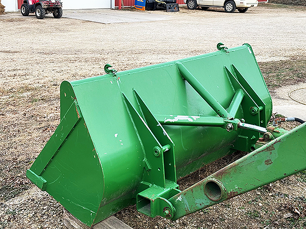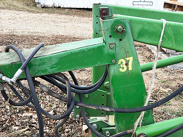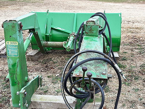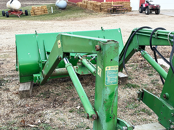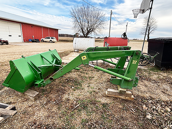 Description: Used John Deere model 37 farm loader, two-spool loader valve, snow/light material bucket. Was originally sold new with an 820 John Deere tractor. Complete loader and mounting brackets removed from this tractor. Will also fit other model John Deere tractors.
