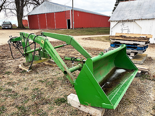 Used John Deere model 37 farm loader, two-spool loader valve, snow/light material bucket. Was originally sold new with an 820 John Deere tractor. Complete loader and mounting brackets removed from this tractor. Will also fit other model John Deere tractors.