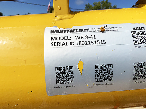 Description: 2018 Westfield WR80-41EMD 8" X 41' auger with electric motor drive kit, Baldor 7½ hp single phase 230V motor with cord and 3-terminal male end, new factory installed tires, includes A249 10" bin hopper kit, upper enclosed chain drive. Low usage auger. Serviced through our shop. Auger is in like-new condition.