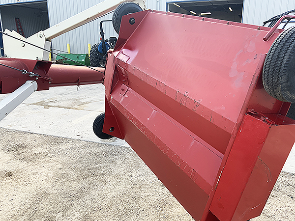 Description: 2007 Buhler Farm King Y1060TMM 10" X 60' gear-drive low-profile swing hopper auger, hydraulic scissor lift transport, one owner, paint is faded, good original flighting. Serviced through our shop. New tires just installed.