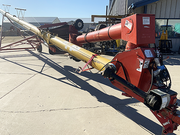 Description: Used Westfield MK100-61 10" X 61' gear-drive low-profile swing hopper auger, hydraulic lift, includes the A200/A293 right-angle drive kit. The gearbox can be installed to the right side (as shown) or the left side. Optional: can remove the right-angle drive kit if not needed and install the in-line CV PTO shaft (not included). Has the electric hopper mover kit with light and a remote control. Good flighting. Auger has been serviced through our shop.