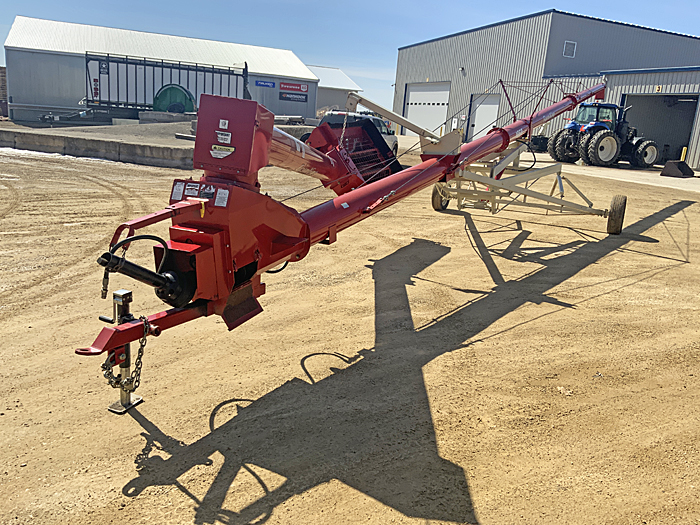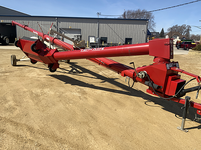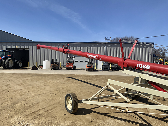 Description: Used Buhler Farm King Y1060TMM 10" X 60' gear-drive low-profile swing hopper auger, 540 CV PTO drive, good original flighting, safety tow chain, lower usage, very clean straight one-owner auger. Serviced through our shop.