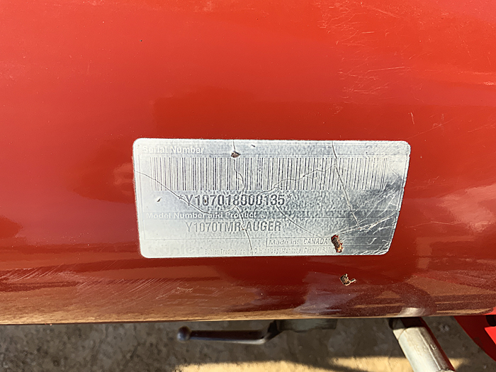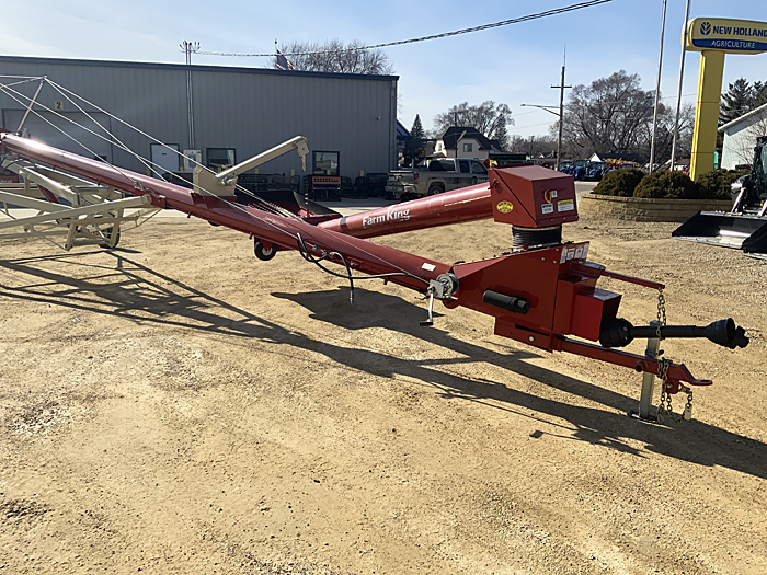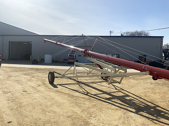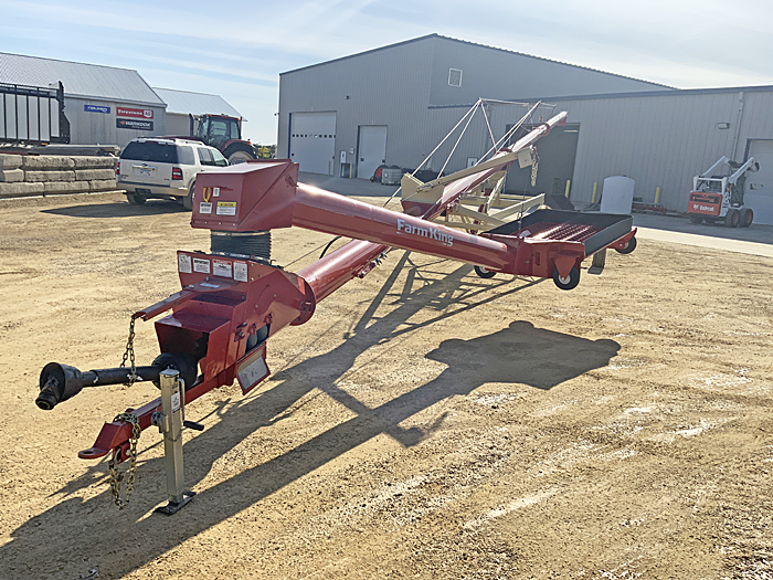 Description: Used Buhler Farm King Y1070TMMR 10" X 70' gear-drive low-profile swing hopper auger, has reverse kit, safety tow chain, new low profile hopper assembly, new hopper incline flighting, new flighting in main auger. Serviced through our shop. Very clean, straight auger; auger is in like-new condition.