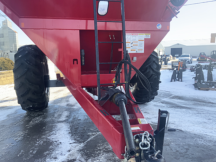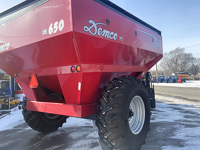Description: Used Demco 650 14" corner-auger grain cart, 650-bushel capacity, (no tarp, no scale), Goodyear 24.5-32 Dyna Torque II R1 ag bar tires, safety tow chain, combination single tang/clevis hitch, transport lights, work light, 1⅜" 21-spline 1,000 rpm PTO with overrunning clutch, heavy duty jack, operator manual, one owner, purchased new in 2012, used on fewer than 5,500-bushel total since new, red color. Serviced through our shop. New condition.