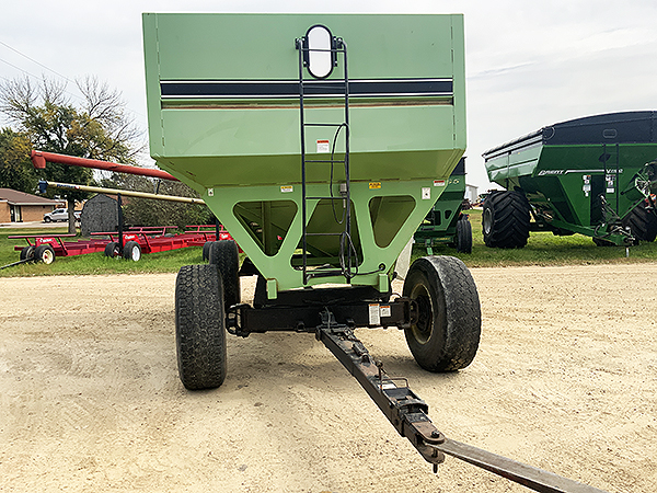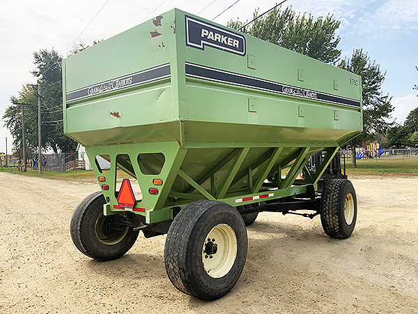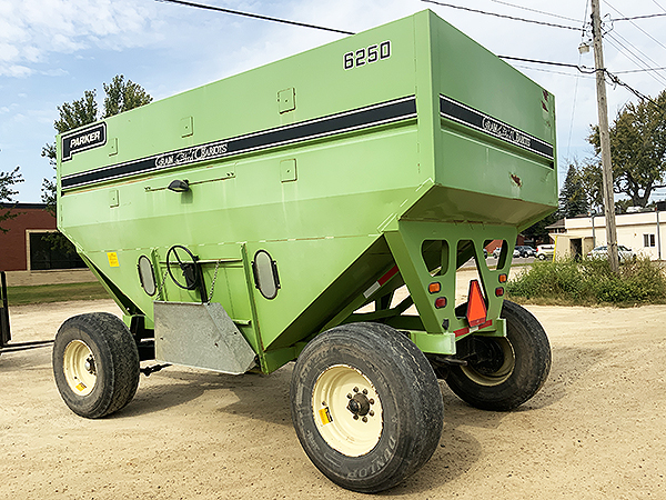 Description: Used Parker 6250 625-bushel grain wagon, 4-wheel brakes, transport lights, side discharge work light, 425X22.5 used truck tires. Overall very good condition. Brakes/lights all working. Consigned unit. Slight paint fade; could be waxed out.