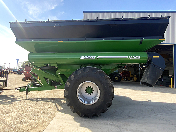 2019 Brent V1100 1,100-bushel 20" corner auger grain cart, 1250/50X32 R1W tires, adjustable axle, factory roll tarp, 5-point scale package with 410 indicator, green color, excellent original flighting, choice of 1⅜" or 1¾" PTO, transport lights and work light. In shed when not being used. Serviced through our shop. Field ready. Grain cart looks like new (no touchup was done).