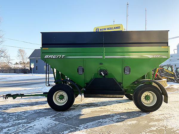 Used Brent 644 grain wagon, 650+ bushel capacity, four-wheel brakes, factory installed fender kit, green color, 425/65R22.5 tires, serviced through our shop.
