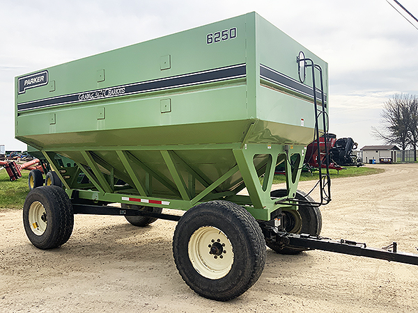 Used Parker 6250 625-bushel grain wagon, 4-wheel brakes, transport lights, side discharge work light, 425X22.5 used truck tires. Overall very good condition. Brakes/lights all working. Consigned unit. Slight paint fade; could be waxed out.