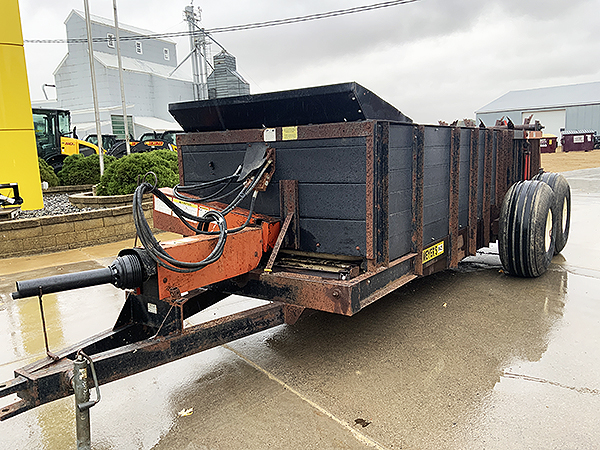 Used H&S 3143 430-bushel tandem axle box manure spreader, two-speed mechanical drive apron with cleanup, hydraulic endgate with two cylinders, upper beater, 16.5LX16.1 flotation tires, T-rod apron chain, 540 rpm PTO. Low usage, one-owner spreader. Serviced through shop. Like new condition.