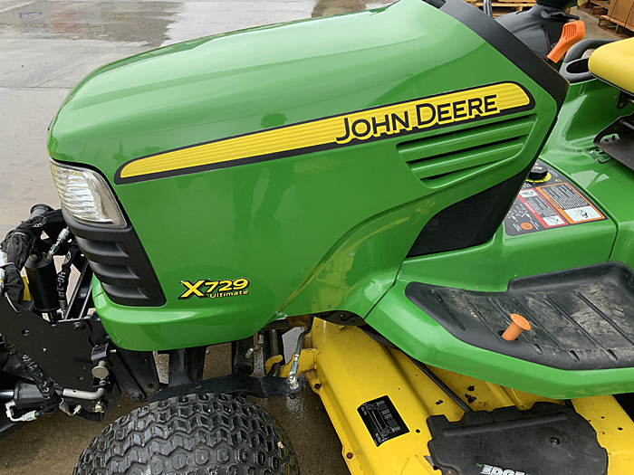 Description: Used John Deere X729 Ultimate 4wd all-wheel-steer garden tractor, 27 hp Kawasaki FD750D EFI 2-cylinder liquid-cooled gas engine, hydrostatic shaft-drive transmission w/Twin Touch foot pedals, cruise control, power