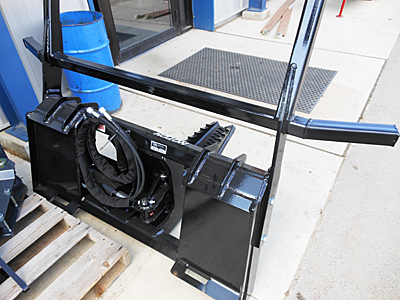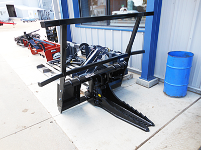 Description: New Notch TP tree/post puller-digger with push-bar guard. Pointed barbed jaws allow digging and cutting roots to ease removal of trees/stumps. Cylinder mounted on back side of puller to protect from being damaged. Shipped with hoses and flat-face couplers. Lists @ $3,325. Note: This tree/post puller-digger has been sold, but please call for current price and availability of a new unit. 10/27/2021