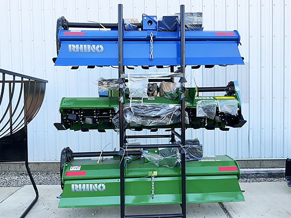 Description: New New Rhino REB84 84" 3 pt. standard tine tiller, 82.5" tilling width, CAT I and II quick hitch compatible, CAT IV 540 PTO with slip clutch, 66" L-knives, 11 flanges. Recommended PTO HP 45/65. Weighs 817 lbs Lists @ $6,180 including factory freight and dealer setup. Note: All four tillers we had in stock have been sold, but please call for current price and availability of a new unit. 04/23/2025