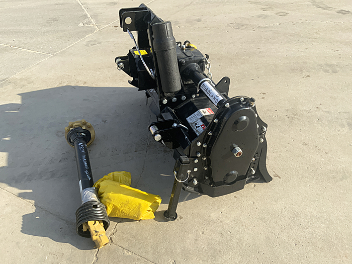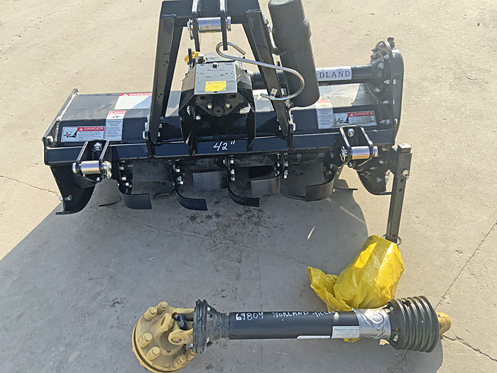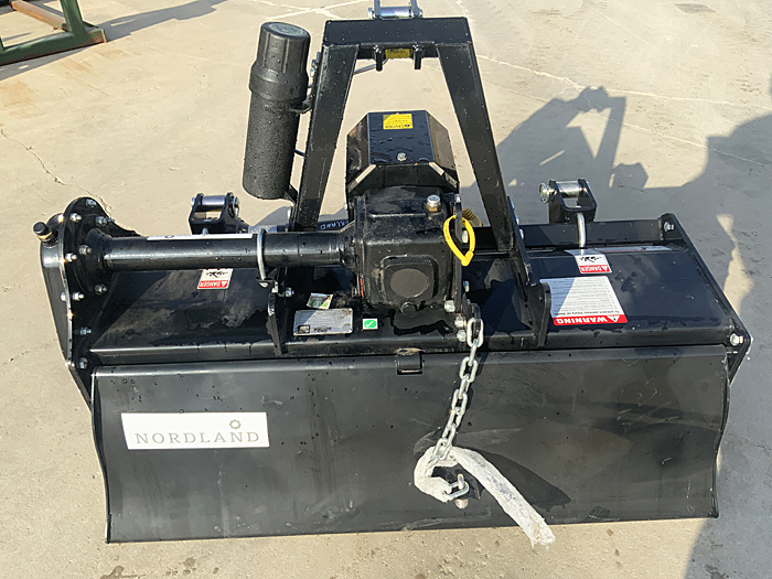 Description: New Nordland UL-42-CH 42" Cat I 3 pt. tiller, quick hitch compatible, 540 PTO drive with slip clutch, side gear-driven oil-bath rotor, requires 20-30 hp, has 30 tines on the 6-blade rotor, adjustable side depth skids, tilling depth up to 5.4", weighs 368 lbs. Charcoal color. Lists @ $3,130. We have two one unit in stock. 03/26/2025