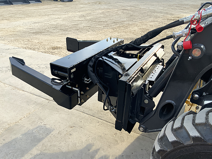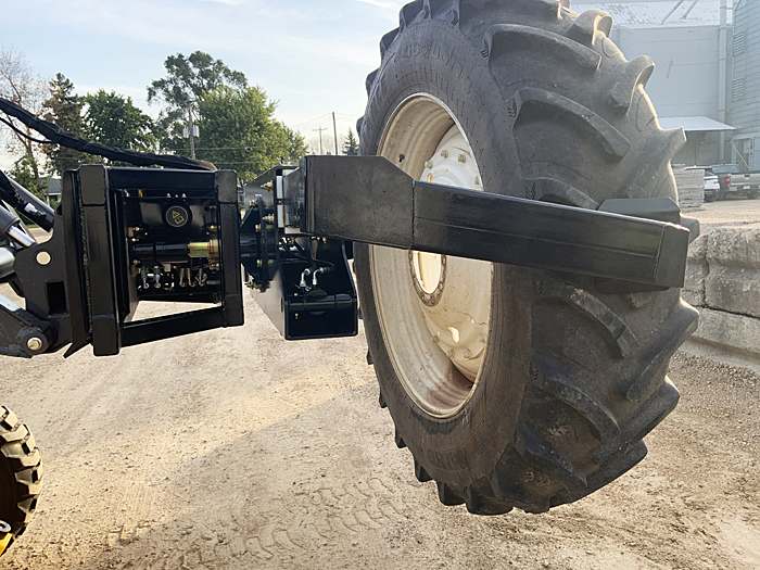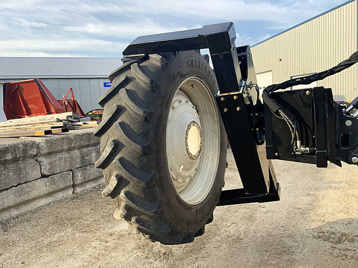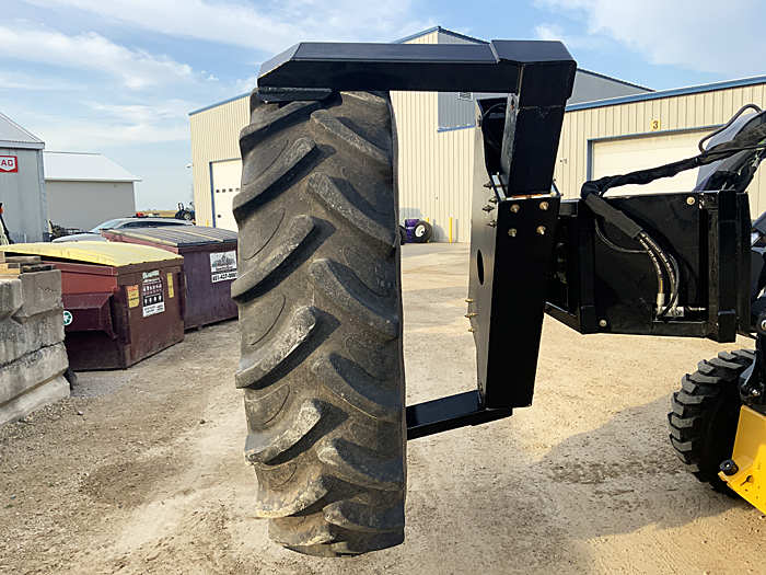 Description: 2025 TMW model "Tire Lifter 96". Opens to 96" wide, closes to 51" wide. Rotate function is controlled by electric hydraulic valve using electric outlet on SSL, safely handles big tires, takes the risk of injury out of changing tires. Unit weighs 960 lbs. List price $6,500, before factory freight & setup. Control harness list for $350. Price includes standard control harness. (Call for price on Bobcat control harness). Click here to view "Tire Lifter 96" in action.