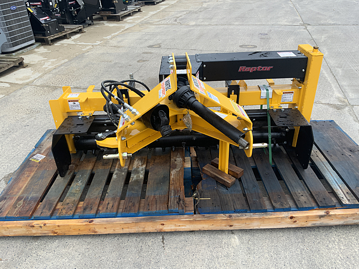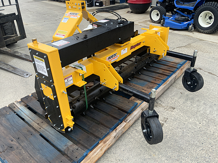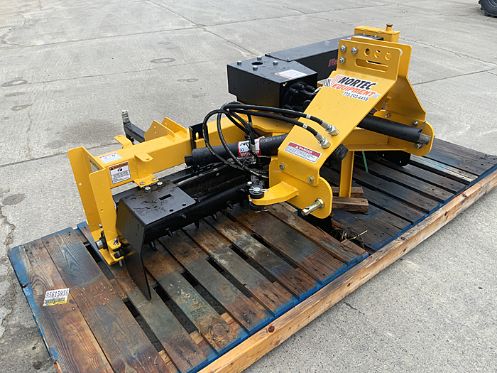 Description: New Nortec compact tractor Raptor NE-350000C 5-foot Cat I hydraulic angle soil processor, 540 PTO, quick hitch compatible, requires 15-35 hp, rear castering adjustable gauge wheels, weighs 625 lbs., 4-foot and 6-foot models also available. Manual angle also available in lieu of hydraulic angle.