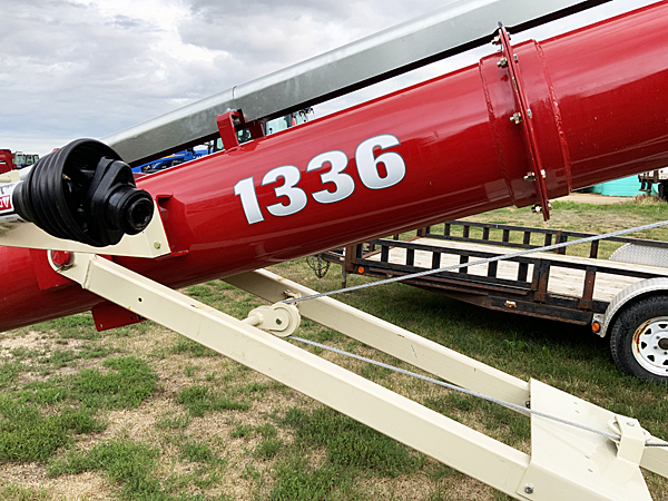New Buhler Farm King C1336D direct PTO drive 13" X 36' auger, upper enclosed lubricated chain drive, double intake flighting, new tires, includes SZ000871A 13" bolt-on hopper (32"W X 36"L X 17.5" H), weighs 2,170 lbs. Lists @ $16,920. Includes factory freight, dealer setup, and prep.
