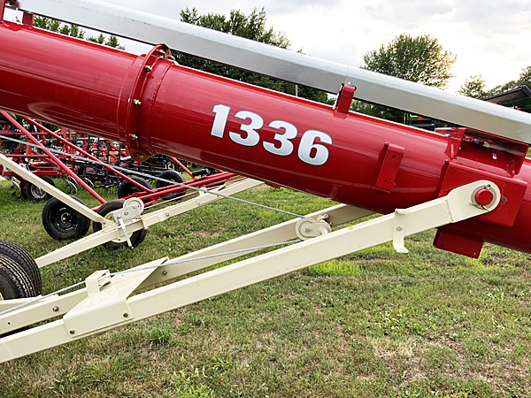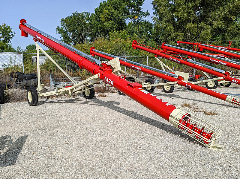 New Buhler Farm King C1336D direct PTO drive 13" X 36' auger, upper enclosed lubricated chain drive, double intake flighting, HD intake guard, new tires. Weighs 1,900 lbs. Lists @ $13,445. Includes factory freight, dealer setup, and prep.