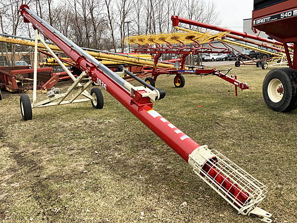 New Buhler Farm King C1031P triple belt PTO-drive auger, enclosed upper drive with #80 chain, heavy duty gear box, new tires. Lists @ $10,350, with freight & setup.