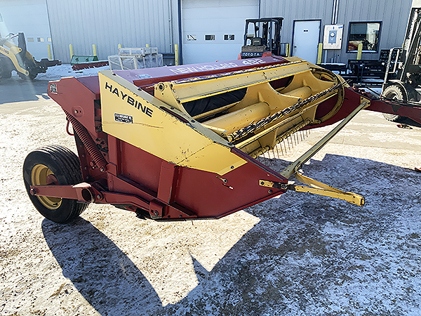Used New Holland 492 9-foot haybine mower conditioner, hydraulic lift cylinder, hydraulic swing tongue cylinder, 540 rpm PTO, good conditioner rolls, cutter bar in good condition, serviced through our shop. One-owner trade-in. Very clean, straight unit; field ready.