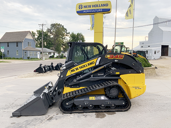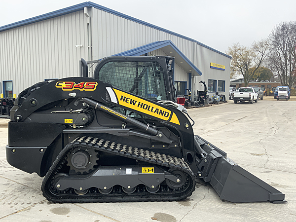 New New Holland C345 track SSL, 2-speed, E-H controls, cab with heat/AC/radio, air ride seat, hudraulic Q-tach plate, E-H cab LCD display, engine block heater, steel lights with turn signals, performance with front electric multi-function, Terraglide 17.7" tracks, 84" low profile extended bucket with factory installed bolt-on cutting edge, ride control, self-leveling, Hi-Flow Plus auxiliary hydraulics.
