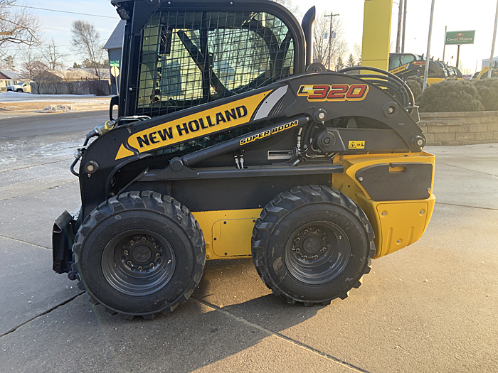 Used 2022 New Holland L320 skid steer loader, cab with heat/AC/radio/lap bar/air ride suspension seat, hydraulic attachment plate, 2-speed with E-H controls, LCD display, front electric multi-function, engine coolant heater, standard flow auxiliary hydraulics, 12-16.5 heavy duty tires, 78" low-profile extended bucket with bolt-on cutting edge, 980 one-owner hours. Serviced through shop. Balance of factory warranty.