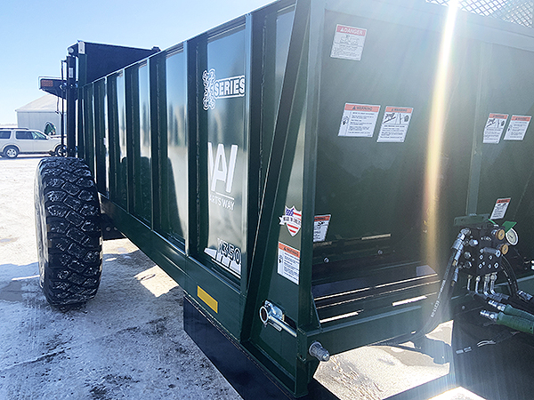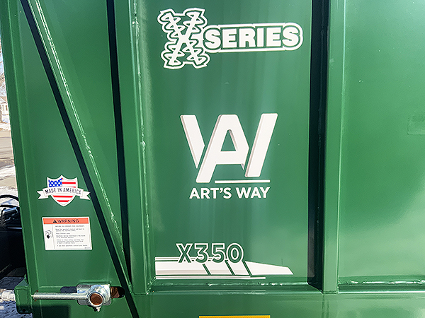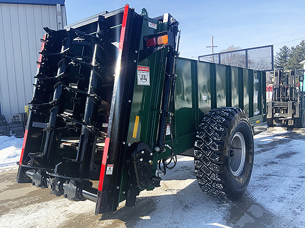 Description: New ARTSWAY X350 single axle vertical beater manure spreader, Berma brand beaters, 540 RPM drive (also available with 1,000 RPM drive), holds 367 cubic feet, guillotine-style slop gate, 16 R20 used military factory installed tires, ½" thick Densilite floor, single apron with 88C pintle chain, tube style apron slats, hydraulic drive variable speed apron, reversible apron drive, estimated 30-foot spread width, 2" swivel hitch, combination single tang/clevis, safety tow chain, transport lights, heavy duty tongue jack. Weighs 8,020 lbs., requires 100-125 HP. Also available with tandem axle.