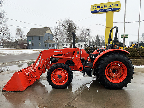 2016 Kubota M7060HD 4wd tractor, 71 engine horsepower, ROPS, 8X8 gear-drive transmission with hydraulic shuttle (4 speed with 2 ranges), 16.9X30 Goodyear Dura-Torque DT 221 rear tires, 9.5X24 Goodyear front tires, 2 rear wheel weights per side, Cat II 3 pt. with top link, lower 3 pt. arm stabilizers, extendable 3 pt. lower links, 540 rear PTO with flip-up shield, 1 set rear remote couplers, rear work light, engine coolant heater, spring suspension seat, tilt steering column, Kubota LA1154 quick-tach loader, SSL mount plate, front grille/brush guard, front auxiliary hydraulics, joystick loader valve, 84" bucket, bucket level indicator, loader S.N.: B2189. One owner with 627.9 actual hours. Very clean, sharp unit.